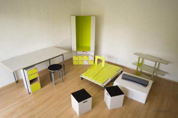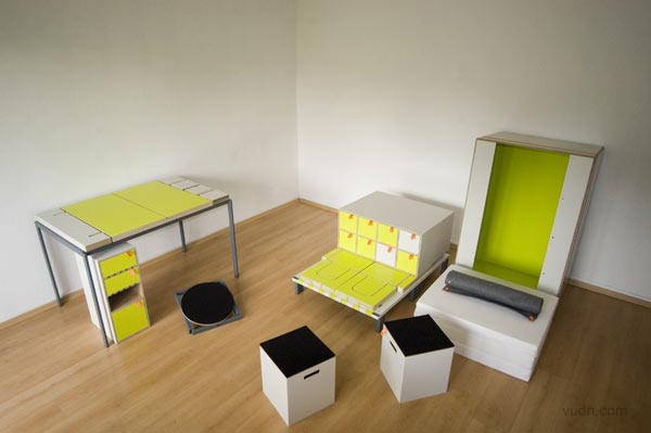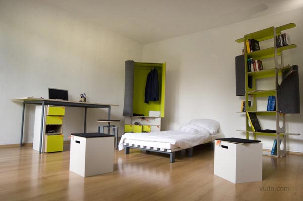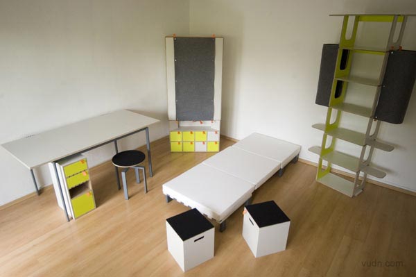 他們將整間房間,或者說是整套公寓的所有家具藏了起來,藏在一個80cm x 120cm小盒子里。盒子內含書桌,床,書架,柜子,桌子椅子,盒,衣架等家具。 兩個人就可以提起,搬運并且裝配每一部分只需要10分鐘的時間。裝配不需要任何工具,而且盒子的外部包裝部分也被利用,取消了任何不需要的東西和造成浪費污染的外包裝,為那些經常搬家的人或是蝸居斗室的人帶來完美的解決方法。