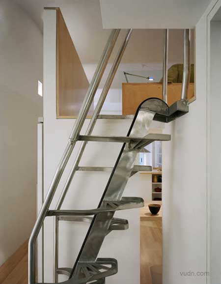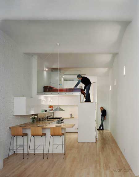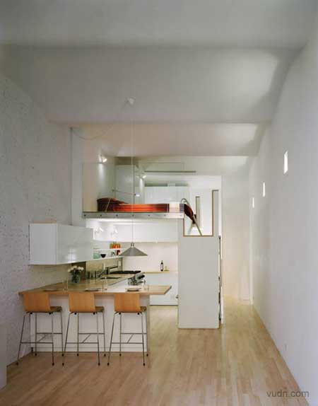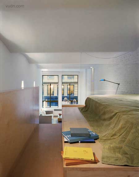 紐約Interlocking公寓室內設計。混凝土拱形天花板有起伏,兩平臺是由一個L形的T型臺交叉,盤旋組成壁櫥,從客廳到入境大堂,創造一個連續的視覺流動,而加劇了獨特的功能, 所有的水平表面和T型臺覆蓋著楓樹木材,而其余的垂直表面漆成白色。一個清晰的玻璃分割劃分的休息區域,采用自然光照明,創造舒適的空間。