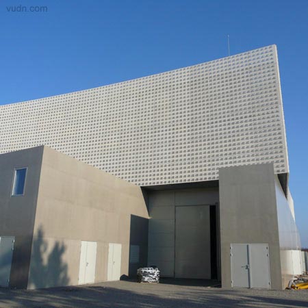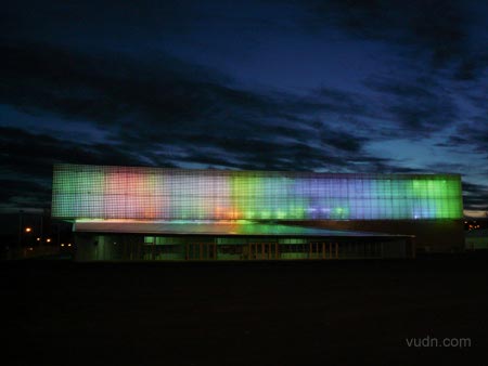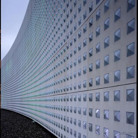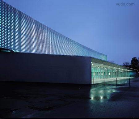 倫敦建筑師Brisac Gonzalez在法國Aurillac完成了一個多用途禮堂設計建造,主要空間將能容納4500人,建筑是一個新的場所,可作為劇院,音樂廳,展覽館及體育場,用于演唱會,體育比賽,貿易展覽和文藝演出。它將包含伸縮式座椅及多姿多彩的可拆卸舞臺。該建筑采用預制混凝土板與網格玻璃磚,安裝熒光燈與彩色過濾器,在晚上不斷變化出不同的氣質。