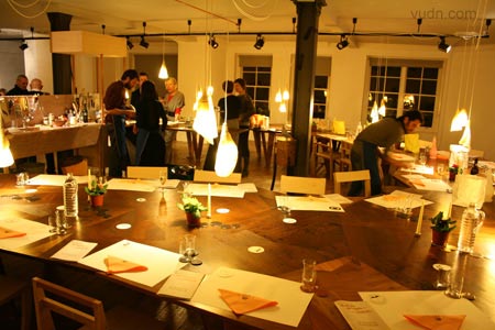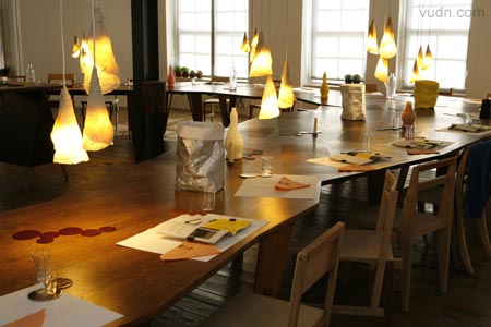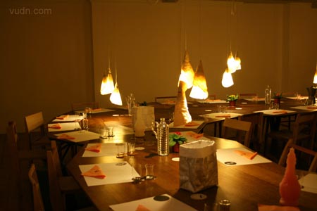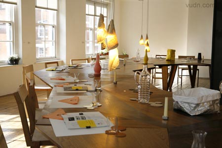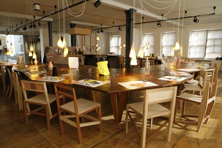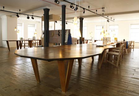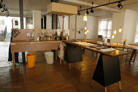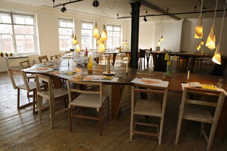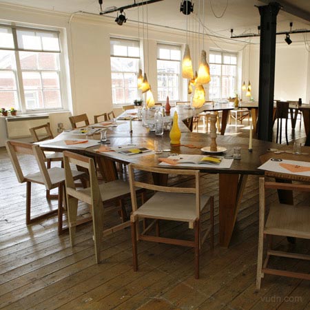 在倫敦Aram Gallery展示的設計師Martino Gamper設計的餐廳Total Trattoria。所有關于晚餐的物件(甚至食物)包括桌子、椅子、 杯子、杯墊等等等等都是他們親自設計制作。家具對接起來形成一個馬蹄形的大型的餐桌。