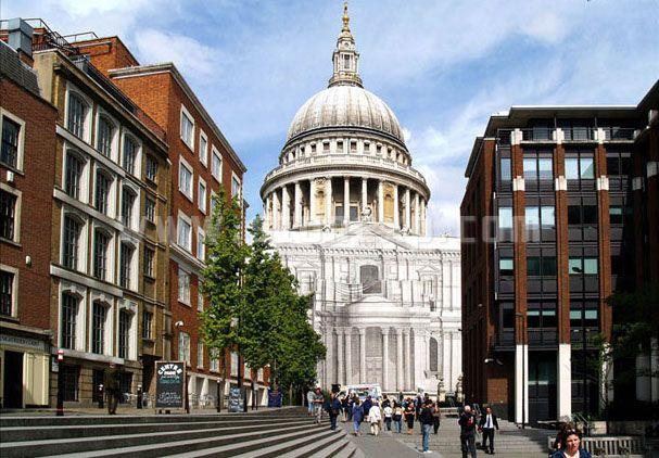 圣保羅大教堂,倫敦曾經(jīng)的地標(biāo),現(xiàn)在的地標(biāo)之一,隔著泰悟士河與之正對(duì)的就是著名的泰特美術(shù)館,這里是它們間的視線通廊,兩側(cè)紅專的新建筑默默地襯托著這雄偉的大穹頂,有如時(shí)空隧道上的定格的畫面,如今老古董面臨立面整容,傷口上蓋上一幅1:1的效果圖,拼貼畫般,更富戲劇性和傳奇色彩。