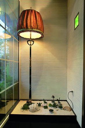 休閑閱讀區(qū):書房另一側(cè),是精心布置的小沙盤,貝殼、小盆景在暈黃燈光下,多么浪漫。臺燈本來要被主人扔掉,設計師的妙手回春,讓它明亮至今。