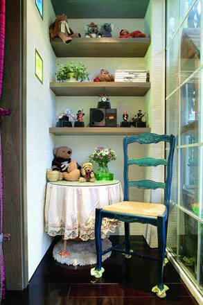 休閑閱讀區(qū):客廳與陽臺之間,連一米都不夠的寬度,也能打造出一個溫馨的所在。田園風和客廳里的妖嬈,形成巨大反差。隔架上堆滿了女孩子喜愛的玩偶,這是一個適合看童話,聽音樂的角落。