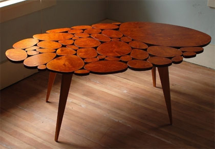 美國俄勒岡州波特蘭的設計師和制造師MichaelArras設計了一系列的矮茶幾。這些矮茶幾用不規(guī)則的圓形櫻木板或者樺木板組成。