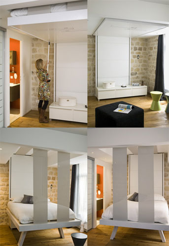 床可以算是家里最占空間的一款家具了。這款奇幻的床不是擺在地面上,而是“從天而降”,白天將其收起,這里就是起居室,到了夜晚再將其放下,這里又變成了臥室。