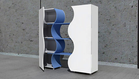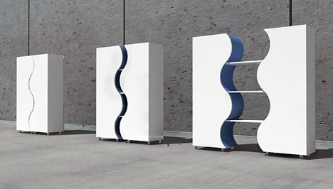 這款雙子櫥柜通過波浪式的分割將櫥柜分成兩個獨立的部分。既可以組合在一起形成一個整體,又能夠抽拉開來獲得更多的存儲空間。