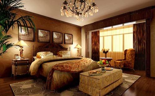 主臥室采用深色的實(shí)木地板和印花地毯分割出“休閑起居區(qū)”和“休息區(qū)”兩個(gè)空間,中間再配上暖色的薄紗,給人一種朦朧浪漫的感覺,讓主人有一個(gè)放松休息、舒適的環(huán)境。