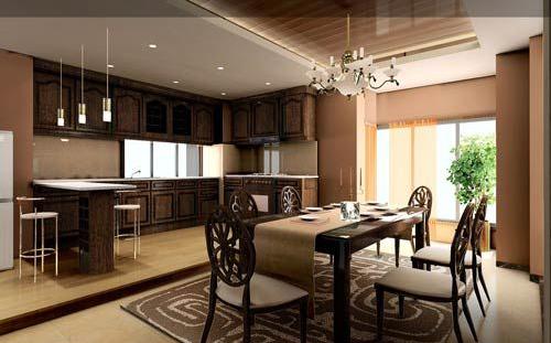 實(shí)木的餐桌和櫥柜、木制的吊頂及仿古磚,充分體現(xiàn)了美式鄉(xiāng)村風(fēng)格,再滿足廚房的操作和餐廳就餐的基本功能的前提下,還為主人提供了一個(gè)小的休閑區(qū),使這個(gè)空間更人性化!