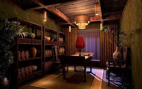 書房使用厚重的木制吊頂、造型復(fù)雜的書柜、寬大的書桌及書柜上的收藏,顯示出主人豐富的愛好及藝術(shù)品位,同時(shí)也營造出一個(gè)可以讓主人釋放心情的獨(dú)特空間。