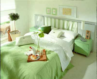淡淡的果綠色會給房間帶來清新甜美氛圍。果綠色的床品,一對綠、白色的靠墊和小型花插讓自然氣息更加質樸濃郁。