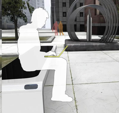 這種椅子的材料是循環利用的鋁和塑料,表面鋪有一層薄薄的太陽能板,太陽能生成的電能被儲存在內部的電池里晚上進行照明。此外,它還有內置的wifi發射系統,坐在長椅上可以方便的無線上網。