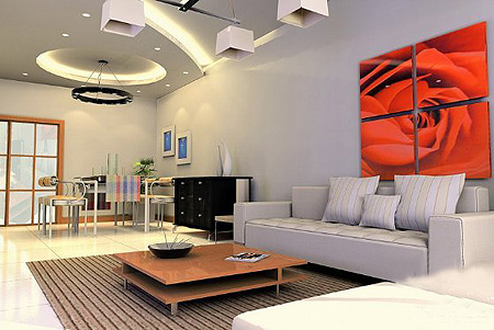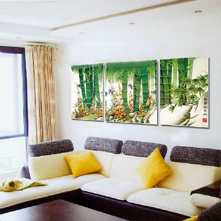 裝飾畫不但可以擺放在客廳內沙發后面,電視機后的墻面上,臥室內,還可以擺放在廚房、陽臺、別墅外面的墻壁上。不過值得注意的是,在擺放時要根據不同的空間進行顏色搭配。一般現代家裝風格的室內整體以白色為主,在配裝飾畫時多以黃紅色調為主。不要選擇消極、死氣沉沉的裝飾畫,客廳內盡量選擇鮮亮、活潑的色調,如果室內裝修色很穩重,比如胡桃木色,就可以選擇高級灰、偏藝術感的裝飾畫。