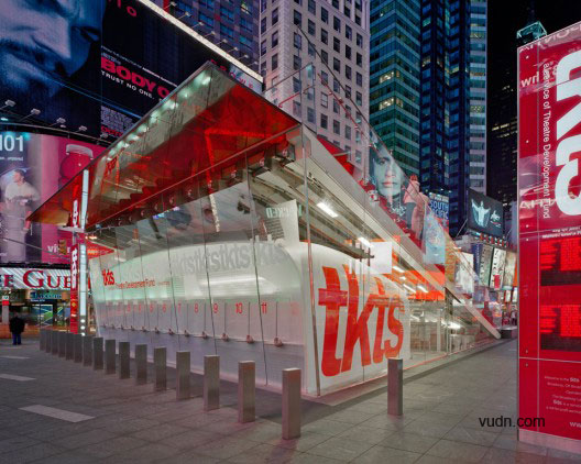 國際建筑設計公司Perkins Eastman在杜菲廣場的影響下,結合細長的三角形公共公園和時代廣場等條件因素設計出這個新的TKTS展位。TKTS展位是一個組合結構的完整性和創新性的設計,同時結合了與最新的玻璃技術和世界主導產業的行家們的知識,該展位也因此成為紐約標志性的城市雕塑。
