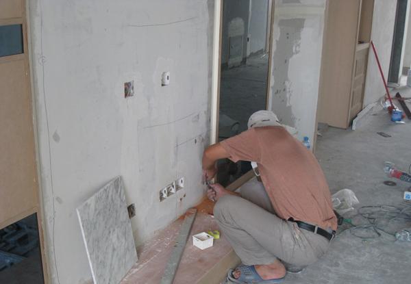 1.由于此案中背景墻面積較大,又凸出墻面10公分,為了安全起見,項目經理建議我們采用干掛形式,也就是在墻面上焊鋼架,通過鋼架上的固定件和大理石塊相連接。這是安裝工人在墻面上劃線定位,安裝固定件。[page]