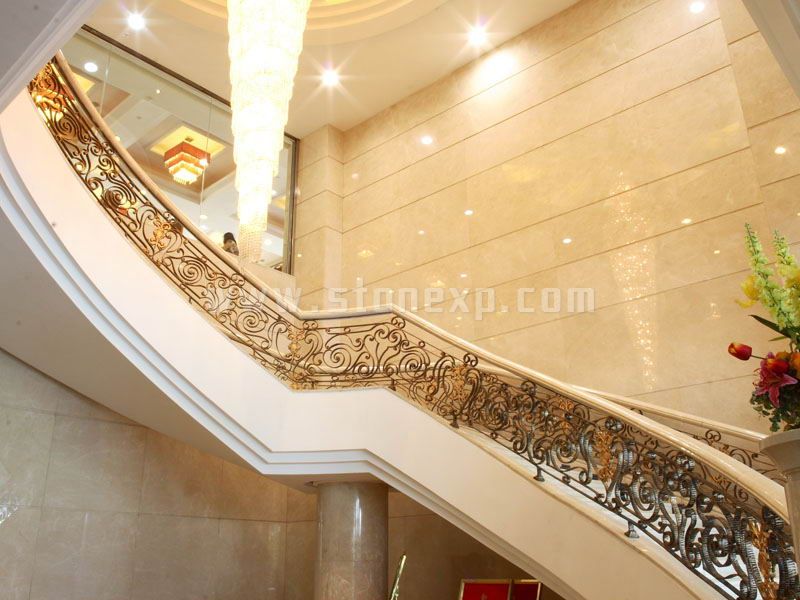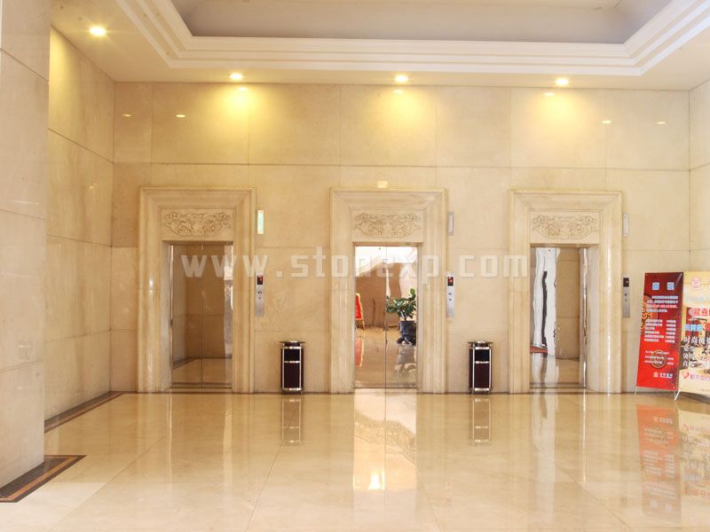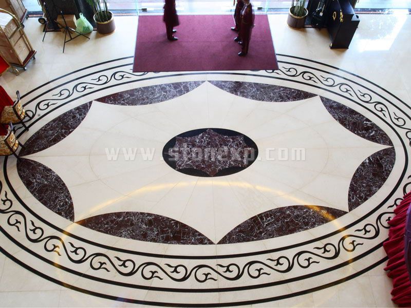 東莞虎門富萊酒店工程最具特色的是其石材水刀拼花,其加工工藝難度極其高,及拼花的設計極富藝術性,傳達酒店獨有的品味與魅力。主要石材用料是:西班牙米黃、黃金米黃、白宮米黃、啡珍珠、金鉆麻、皇室啡,西施紅。