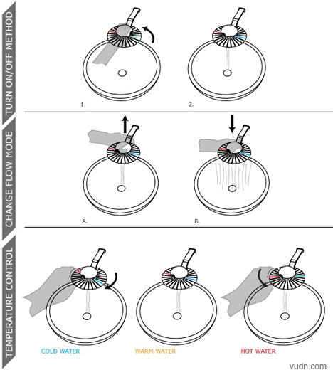 前者的排水方式與傳統方式一致,而后者在石塊頂部按照360度的角度將流水等分,這種方式不僅非常適合運用在洗手池中而且很好的達到了節約用水的目的。你可以通過調節圓盤改變流水的溫度,但是得注意一些說明細節,當你使用第二種排水模式的時候你的手就濕了,而這樣一來你就能憑感覺繼續調節水溫直到合適的溫度,整個過程節省了更多的用水,并且避免了水溫的過高或者過低引起用戶的不適。