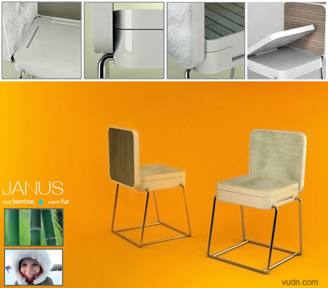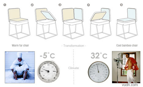 一般情況下,冬天我們喜歡坐在可以保暖的椅子上,夏天坐在非常涼爽的椅子上。夏天坐什么椅子最涼快?當然是竹椅了,不過在冬天就不適合了。相反,如果夏天坐那種毛絨絨的椅子,小心褲子都濕了一片。而這款椅子很好的結合了這兩面,它通過折疊變換,可以讓一張椅子坐成兩種玩法,真正實現(xiàn)冬暖夏涼,非常不錯的小創(chuàng)意。