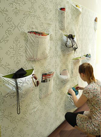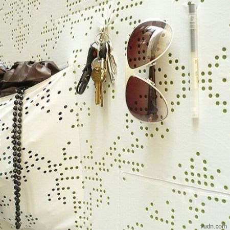 這不是普通的墻紙,它具有彈性,并且有些奇特的部位。嚴格來說,這款密密麻麻布滿點狀花紋的墻紙不能算是墻紙,而應該稱為墻衣。我們可以將小物件通過墻衣小孔掛在墻上,還能將報紙雜志放到墻衣的大口袋里,充分利用了空間。