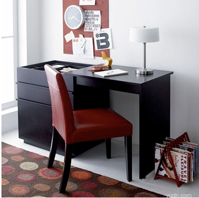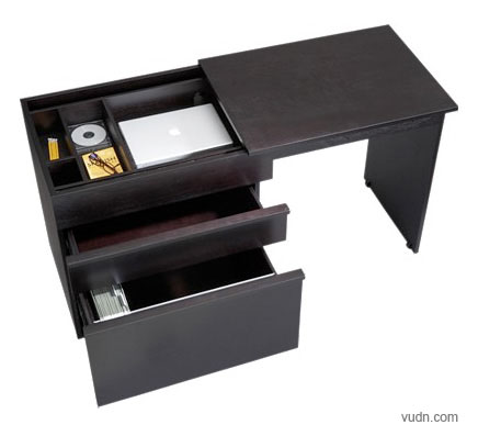 這款桌子可以為您節約空間:在不使用的時候,它就像一個五斗柜,里面可以放很多物品;需要找個地方辦公的時候,您可以省去一張辦公桌,將這個“五斗柜”向右側一拉,就會出現一個很別致的辦公平臺,雖然平臺面積有點小,但對于臨時辦公還是足夠用的。而且用完之后,還可以順手將辦公文具或筆記本電腦放到左側的抽屜里,非常不錯。
