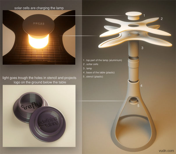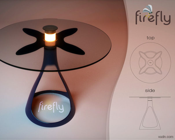 這是由設計師Vuk Dragovic設計的一款茶幾桌,它類似于以往的燭臺茶幾,只是將蠟燭由夜光燈代替,這樣減小了火災災害發生的可能。