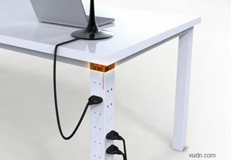 工作臺往往安置在靠近插座的墻邊,即便如此,大都還是需要連結額外的插線板以補充插座的不足。考慮到這一點的設計師將工作桌的桌腿設置為插座,節約了插線板的連結和設置,讓桌面更加整潔。