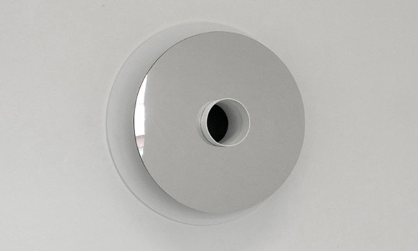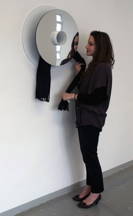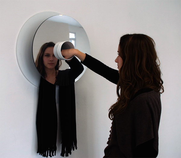 設計出這樣一款鏡子確實需要不少想象力。設計師在普通圓形鏡子中間挖了一個洞,并且在洞中裝上了一根圓筒狀的容器,這樣的鏡子被安裝在墻上后,鏡面與墻壁之間因為管狀容器的存在自然會隔開一段距離,使用者只要發揮自己的想象力就可以讓這款鏡子產生很多用途。
