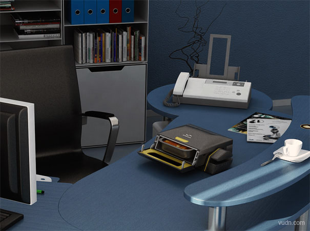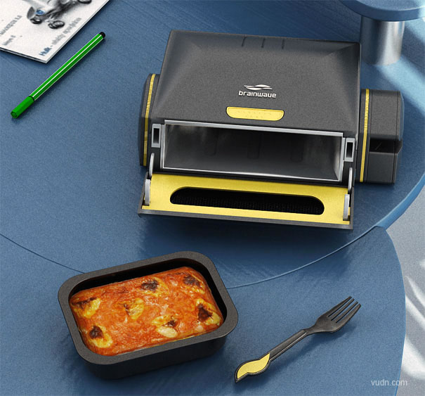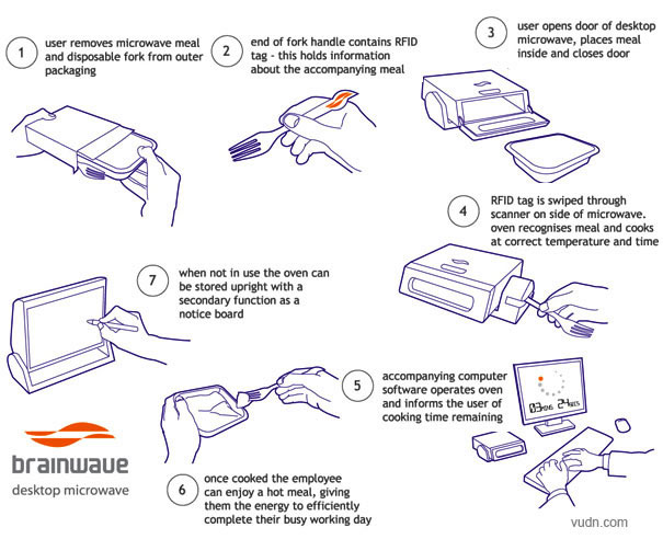 這是一個(gè)桌面微波爐,專為那些工作狂和書呆子設(shè)計(jì),似乎誰也無法讓這些人離開計(jì)算機(jī)。該微波爐可通過USB接口與電源端口連接,通過控制計(jì)算機(jī)來應(yīng)用。一個(gè)帶有RFID標(biāo)簽的塑料勺子將帶有特殊包裝的食物和標(biāo)簽信息經(jīng)掃描傳送到微波爐,然后反過來又自動(dòng)設(shè)定加熱時(shí)間。這樣就可以吃到熱騰騰的食物了。