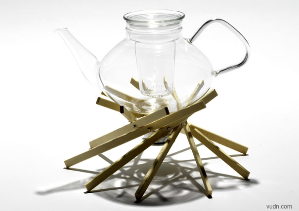 Christoph Matthias設計的這款茶壺加熱架為茶人們提供了一種獨特的熱茶方式。使用這款產品的時候,看上去就像升起了一堆篝火,能讓人想起室外溫暖的火光和美好的環境。打開木板樁點火,然后隨著上面的茶葉慢慢墜落,就可以品嘗第一口茶了!