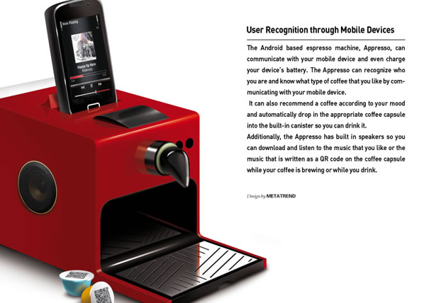 這款咖啡機內嵌了Android系統,并且在每個咖啡膠囊上都印有一個二維碼,當用戶把咖啡膠囊放進咖啡機里,系統會自動掃描二維碼。這樣,用戶就可以邊品嘗咖啡,邊享受音樂了。