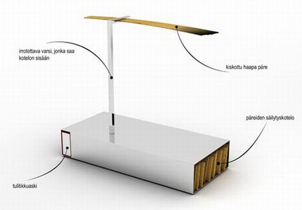 在高科技產品層出不窮的當代社會,設計師Tapio Anttila開發出了一款性能獨特的帕爾燈。這種新式設計由輕型不銹鋼、支持夾板等可再生的天然材料構成,除此之外,該裝置還擁有足夠的空間來進行夾板和火柴的存儲,如此優秀的產品在很大程度上適應了未來生態社會的需要。