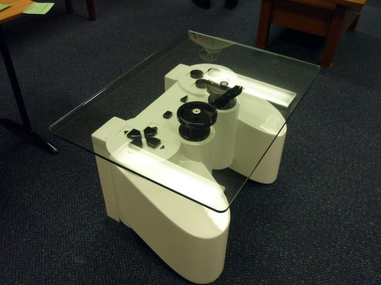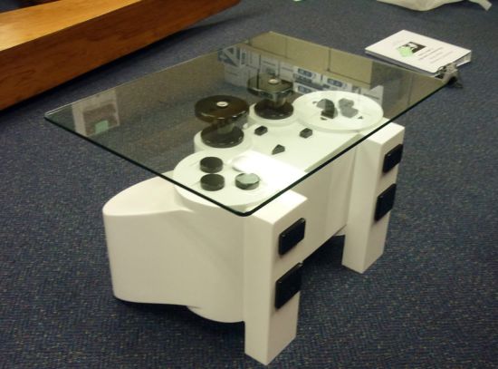 游戲手柄式咖啡桌集成了巨大的playstation為基礎的遙控器,它由膠合板,中密度纖維和膠合板制成。如果你想要泡茶,只要想按遙控那樣就可以簡單的完成了,白色的遙控器和黑色的按鈕相得益彰,而位置的安排可以說是很恰當的。外表的裝飾,使你的生活像游戲搬快樂。