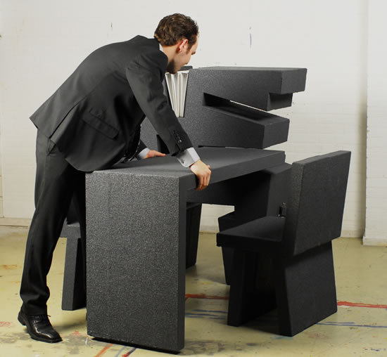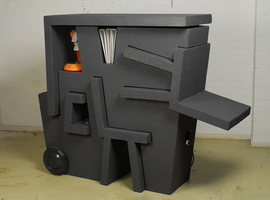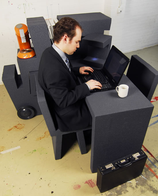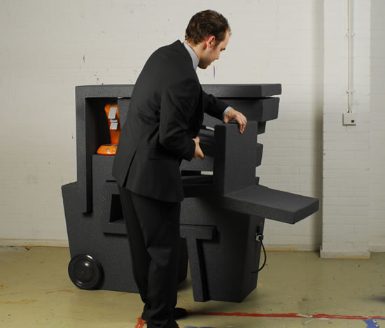“kruikantoor”是一個便攜式辦公室,由EPS泡沫材料制成,外表有一層 熱噴涂聚脲。這個移動辦公室包括兩把椅子,一個桌子,臺燈,電源插口以及儲存柜。你可以把這些零部件組合起來變成一個整體的推車或是把它們拆分開來組成一個完備的辦公室環境。這個辦公室裝有輪子,可以讓使用者便捷的改變工作地點。