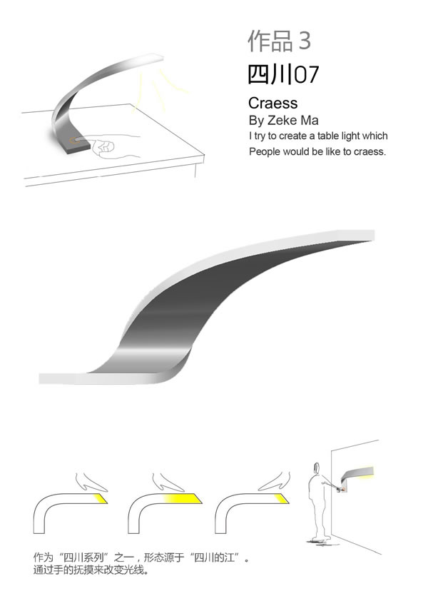 詳細說明:“撫摸”是這款交互式臺燈想要表達的主題。當你的手順著它的曲線“撫摸”時,燈光會柔和地變亮,當你再反方向地“撫摸”時,燈光又會漸漸熄滅。