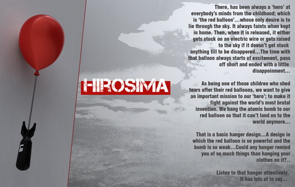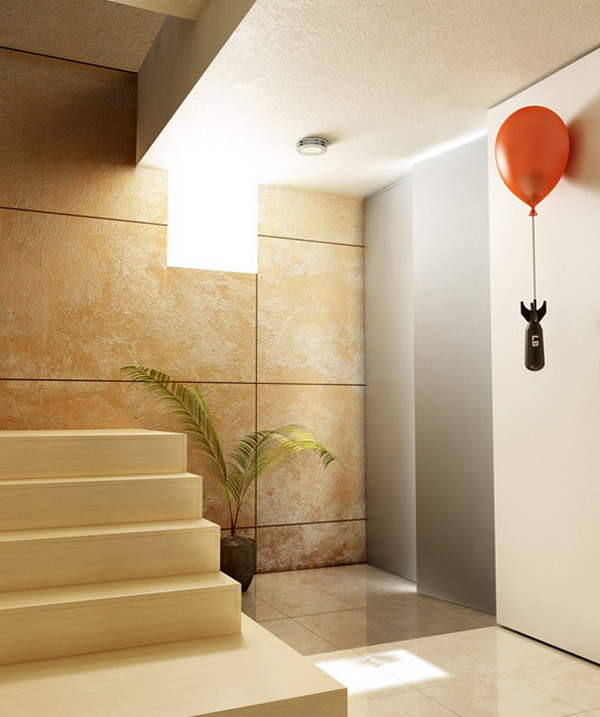 1945年,美國在廣島投下了第一顆原子彈,造成的破壞與傷害至今尚未完全消除。這款炸彈吊燈就是為了紀念這一事件而設計的,吊燈由紅色的氣球狀燈罩和下方的“原子彈”組成。懸在空中的“原子彈”表達了設計希望那顆帶來無數悲痛的炸彈永不落地和戰爭永遠處于懸停狀態的美好愿望。除了照明裝飾作用外,您還可以在“炸彈”上搭掛一些衣物,起到衣架的作用。