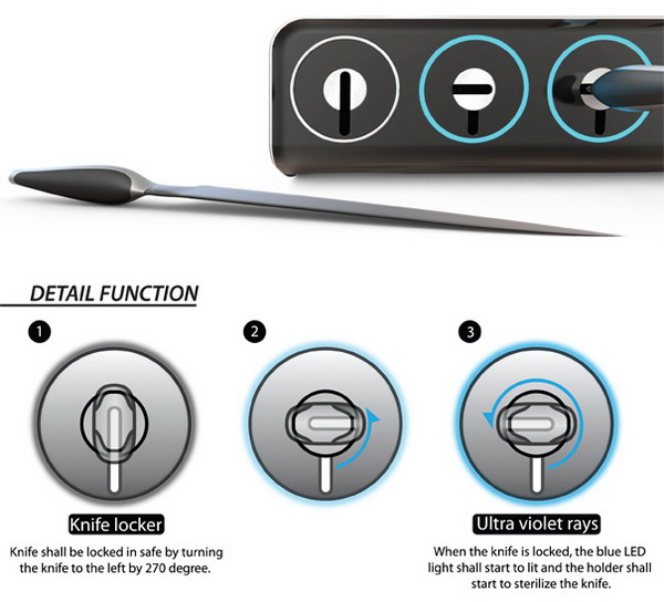 設計師Min Seong Kim的這款帶鎖的安全刀插 (Knife Locker),試圖解決這個問題,在方便的基礎上兼顧安全:一般來說刀把和刀寬,,都是刀把細而刀片寬——而這種寬度上的差異,在設計師看來,就剛好可以成為一種很棒的鎖止機構。也是結構就很好理解了,將刀往刀插里面一插,順手一扭,刀片就會卡在刀插里面,讓這把刀不能簡單地直接一拉就取出。當然,這種結構下,要取用刀具仍然很簡單,握住刀把反方向旋轉,刀片對準出入口后,一拉就出來了。對你我大人而言,這個增加的動作不會造成任何功能上的困擾。但是對小孩子而言,這個動作也許就能避免他們意外受傷。