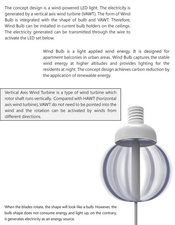 這是一盞風力發電的陽臺裝飾燈,光寶獎的得主,它被設計在城市地區公寓的陽臺。這是一款不可多得的低碳環保產品,可以依靠風力發電的陽臺燈。它的造型非常的特別,長長的燈線與地面垂直,頂端螺旋槳結構,并且還配有樹脂橡膠質地的風葉,通過風葉的轉動來供給LED燈足夠的電能,喜歡這類能源循環利用的設計。