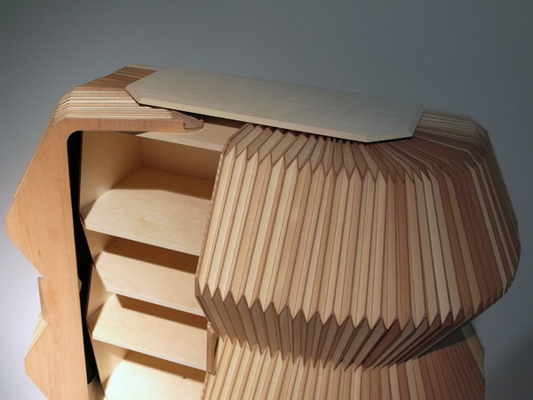 這件儲藏柜外部的薄木片層像手風琴一樣被折疊起來。用激光切割的木片手工固定在一個織物(比如萊卡布料)表面上。 這兩種材料的巧妙結合,讓木片表面像布料一樣柔軟有彈性。手風琴一樣的表皮將矩形的柜子包裹起來,不用的時候它就像門一樣可以關閉。