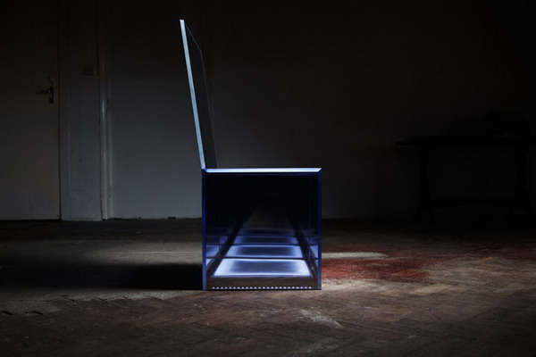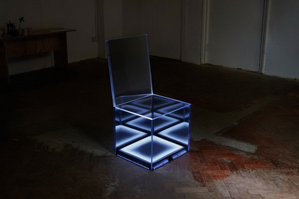 這把被設計師賦予了“隱身”功能的座椅將于2月份在英國皇家藝術學院展出,它向人們展示了一種依附于意識形態(tài)的設計理念。椅子的“隱身”功能依靠貼有單向鏡膜的鏡面有機玻璃實現(xiàn),這些有機玻璃可以有效地反射出周圍環(huán)境,讓椅子看上去如同懸空一樣。除此之外,設計者還在座椅內部加裝了超聲傳感器與LED照明燈,當傳感器探測到有人靠近時,便向LED燈發(fā)出脈沖信號,燈便會如心跳般閃爍,與此同時,座椅下表面會逐漸變透明,邊緣也會泛起藍光。當傳感器“確認”有人要上座時,LED燈才會停止閃爍。高科技的支持和新穎的設計讓這款座椅極具夢幻效果,十分吸引人。