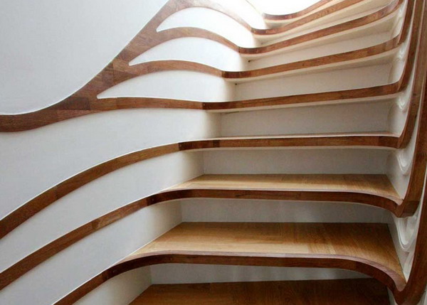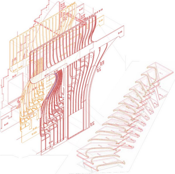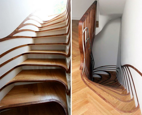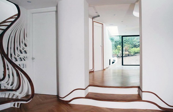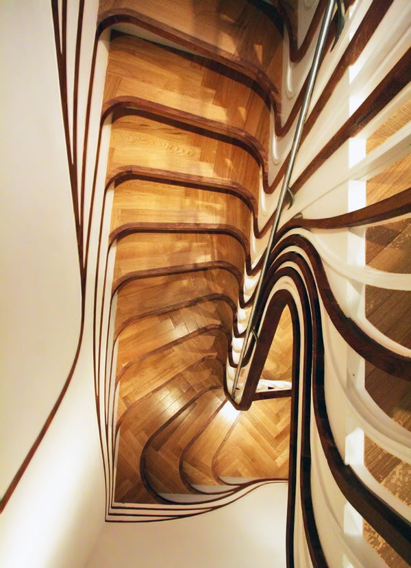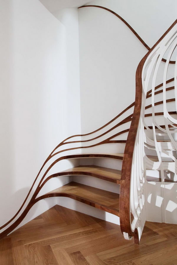 這個極具雕塑感的樓梯是由倫敦事務所atmos studio的設計師alex haw為一棟私人住宅設計的,這個獨特的樓梯在住宅空間中扭動,并將自己流動的形態與地腳線圖案有機的融為一體。為了與已有的空間布置相協調,設計師希望在視覺上將這個樓梯間和其它生活空間聯系起來,樓梯扶手向下延伸到浴室中,并順著墻面伸展開來,纏繞了周邊的家具,將本身的形態完全融入到空間中。