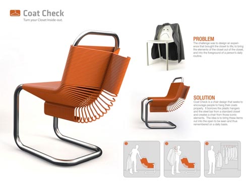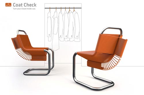 這是Joey Zeledón為衣帽間設計的椅子,它只有一個簡單的金屬框架,特別之處在于衣架可以套入在框架上,形成椅座和靠墊。這樣,不僅能收納衣架,也能成為一把座椅。而且衣架非常牢固,能承受人體的重量,坐在衣架椅上也不會使其變形。