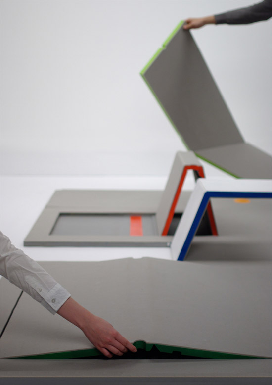 Land Peel 是由日本設計系學生 Shin Yamashita 設計的一款多功能的地墊,它們的功能就體現在折疊上了,對地墊進行全方位的切割,當它鋪平之時就是個普通的地墊,當我們開始折起它們的時候,就變成了一個辦公桌、一個茶幾、一個靠背椅等等。
