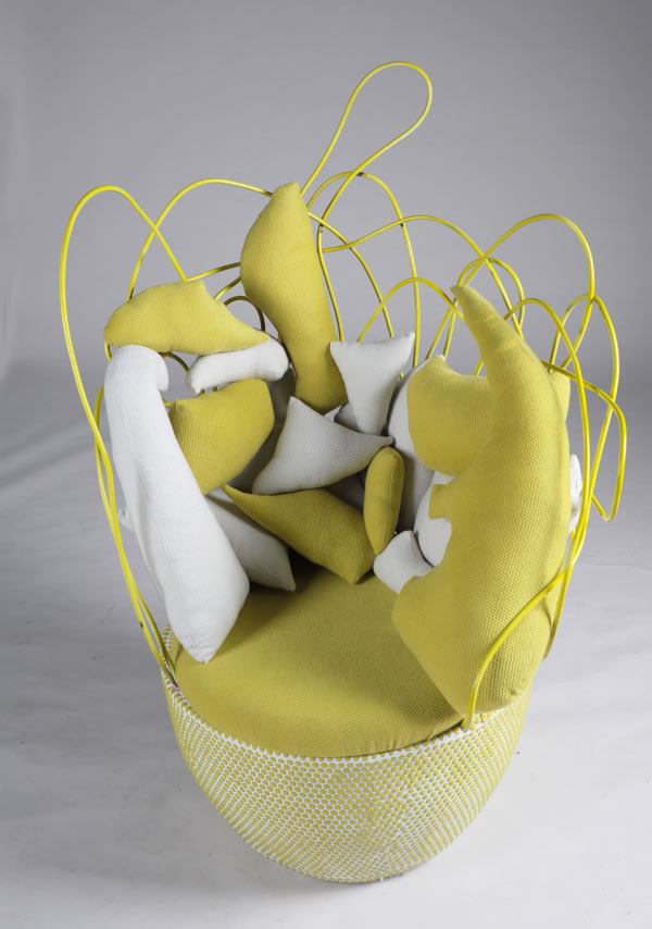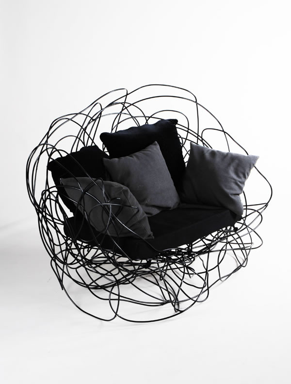 作者:李梓熒 指導教師:丁嘉明 打破家具固有的結構形式,大膽嘗試運用線條構造,塑造出另類的別樹一格的線條椅。整個椅子只采用鐵絲做的,通過線條之間的無意穿插,不但起到固定作用,還形成不規則的紋樣裝飾了整個椅子。呈現出強烈的流線視覺沖激。遠看還能產生錯覺效果,讓人誤以為是平面構成的,甚至當人坐上去還以為人被線條給網住了。這效果是其它椅子所無法比擬的。