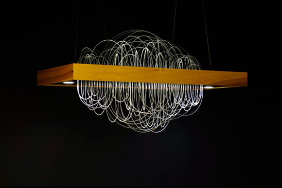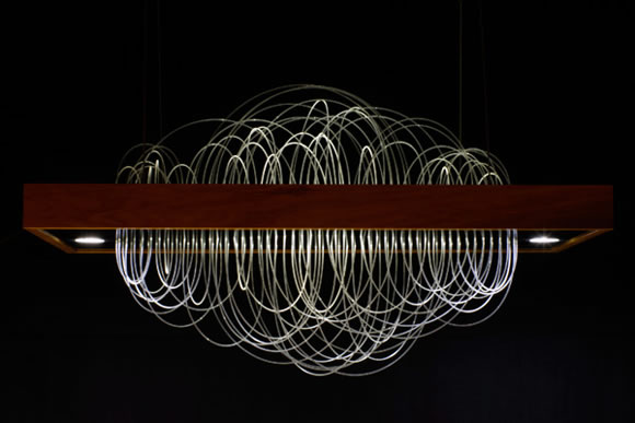 聽到光釬,有些人可能會想起以前家里要收費的電視機,但其實光釬完整定義是一條玻璃或塑膠纖維作為讓訊息通過的傳輸媒介,中心是光傳播的玻璃芯。來自1:1工作室的這個吊燈給人的第一印象就是頭發狀、彩虹燈和復雜的纏繞曲線,但是不管怎樣,它確實能讓人目光停留許久。不管白天還是夜晚,發不發光,它都是一個獨特個性的藝術品。