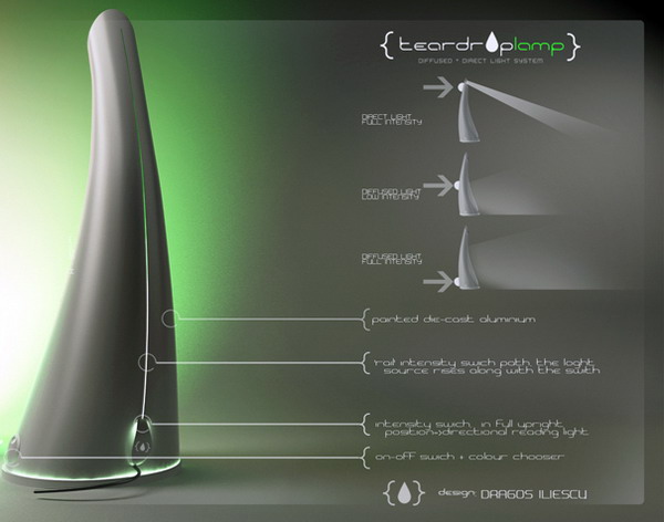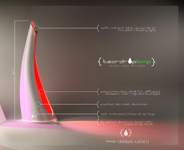 這是一項歌頌愛神維納斯,以其充滿女性特質的形象去設計而成的淚滴臺燈,在外型上展現美麗的線條,而從內透出的光線使整間房間都充滿溫暖。燈光的強弱可經由滑動式的開關隨意調整,在燈光最微弱時,可作為讓您半夜起床喝水不會失足跌倒的夜燈;在燈光最強時,可以讓您連書籍中最小級的文字都看得清清楚楚。