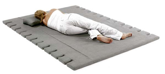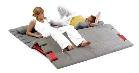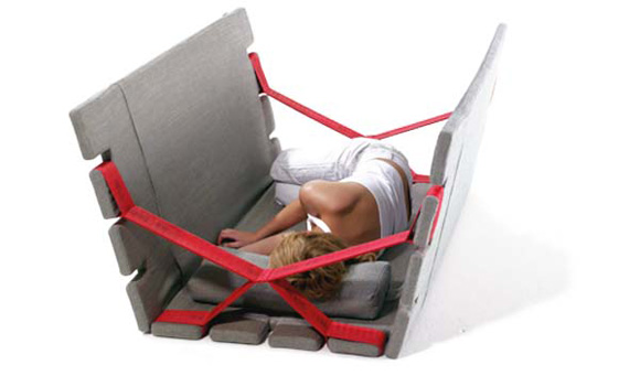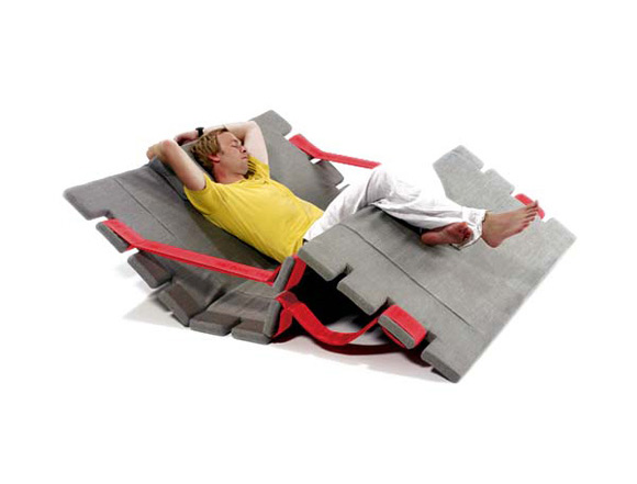 市面上的沙發(fā)種樣式各異,一般的沙發(fā)最多能夠拆散組裝成一張簡易的床,但是拆卸過程顯得麻煩,且每一個(gè)個(gè)體都很笨重,搬運(yùn)起來顯得極為不便,設(shè)計(jì)師Alexander Munk 對此進(jìn)行了改良,創(chuàng)制出了這款實(shí)用的輕型多功能沙發(fā),與傳統(tǒng)不同的是該沙發(fā)由三塊主體構(gòu)成,中間由紅色寬線連接,可以變換成躺椅、床墊、帶隔層的單人床,每一塊沙發(fā)的傾斜角度可以任使用者選擇,模塊化的構(gòu)造也便于儲(chǔ)存和放置,節(jié)約了房間的空間。