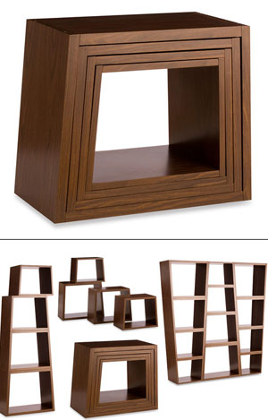 在6月初推出的書架,由大小不相等的等腰梯形自由組合而成。隨心所欲地擺成你想要的造型。不要時就把它們疊起來,也不占空間。