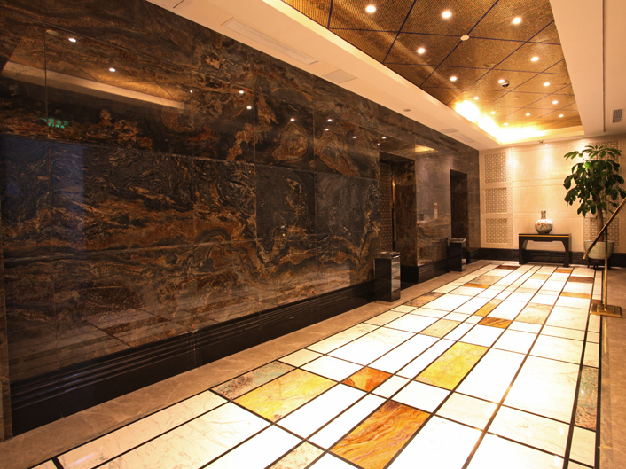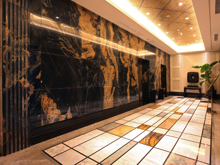 特色石材新品種“路透社”應(yīng)用于金悅酒店電梯間形象背景墻,純黑的底色,流動的黃色金沙紋理,體現(xiàn)了中國傳統(tǒng)文化風(fēng)格及奢華高貴氣息。石材大板之間紋路連接流暢,隨性自然,整體版面大氣,形成撼人心魄的感官刺激地。 |
