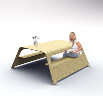 這款餐桌看起來就像是用一塊單獨(dú)的木片制成,然后在再兩邊摳兩個(gè)洞,將木片折進(jìn)去,就成了椅子。給人很強(qiáng)的視覺沖擊。當(dāng)然,實(shí)際的工藝會復(fù)雜得多。