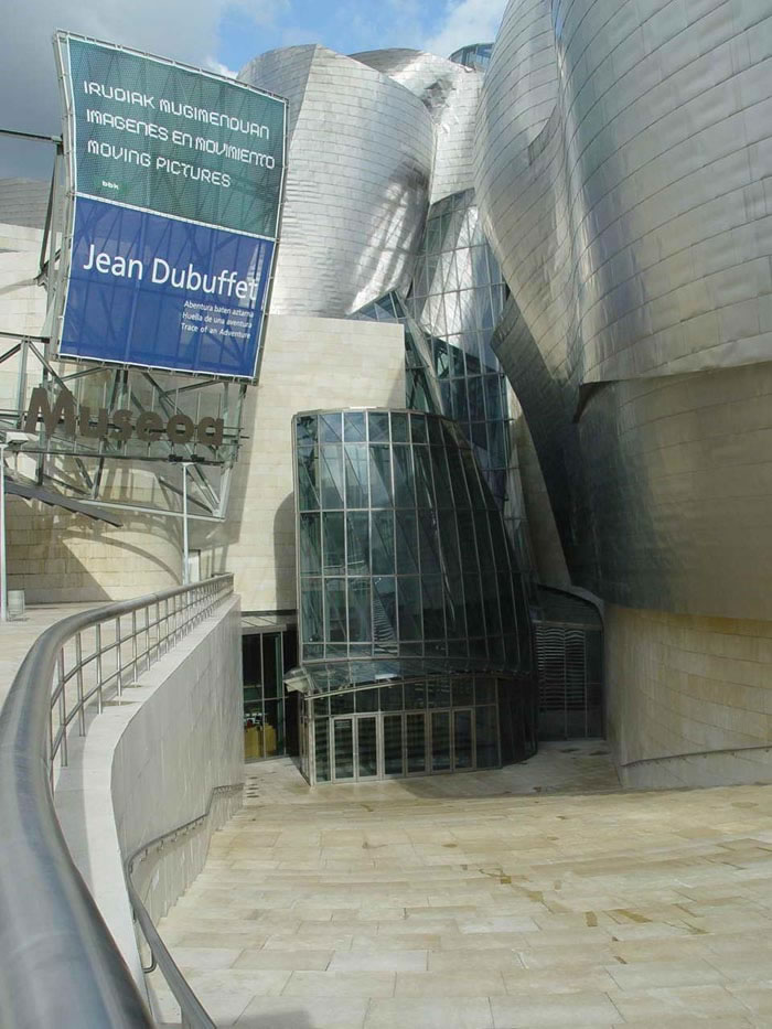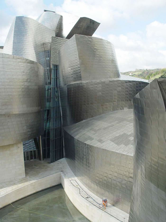 從內維隆河北岸眺望城市,該博物館是最醒目的第一層濱水景觀。面對如此重要而富于挑戰性的地段,蓋里給出了一個迄今為止建筑史上最大膽的解答:整個建筑由一群外覆鈦合金板的不規則雙曲面體量組合而成,其形式與人類建筑的既往實踐均無關涉,超離任何習慣的建筑經驗之外。在蓋里魔術般的指揮下,建筑,這一章已凝固了數千年的音樂又重新流動起來,奏出令人瞠目結舌的聲響。