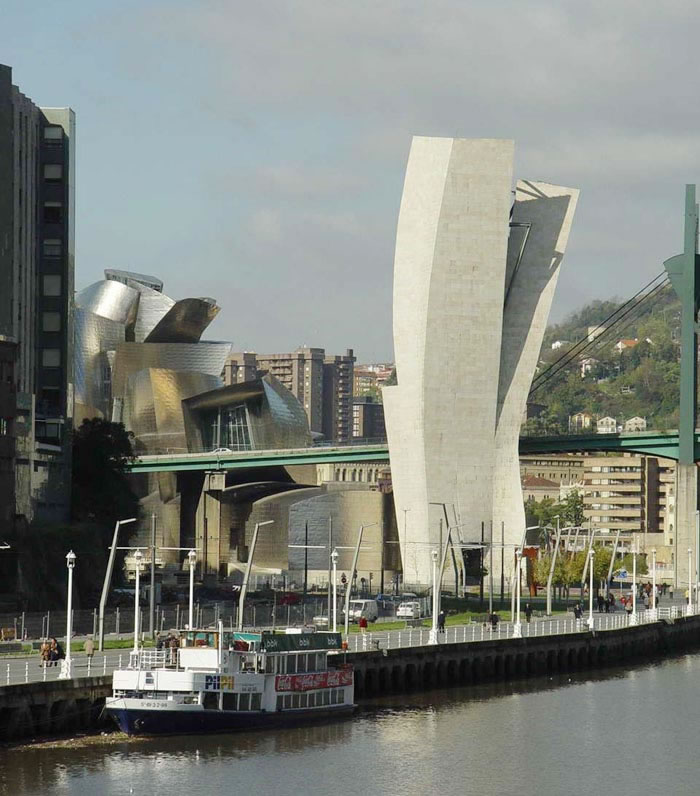 這個作品中盈溢的那種暗合于西班牙文化的、既激揚又沉靜的詩意,不僅傾倒了全世界的萬千民眾,也折服了無數對蓋里滿懷偏見的建筑師。當然,最幸福的應屬畢爾巴鄂市的居民,當天起涼風,日影飛去,整個博物館因光陰的流轉而幻化出奇異的迷彩,河面粼波浩蕩,光影上下相逐,整座城市隨一棟熠熠閃爍的建筑舞蹈起來的時候,他們是否已淡忘了城市痛苦的過去,不知今夕何夕?